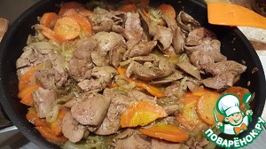 Когда печень с овощами готова, перекладываем её в удобную посудину для измельчения.