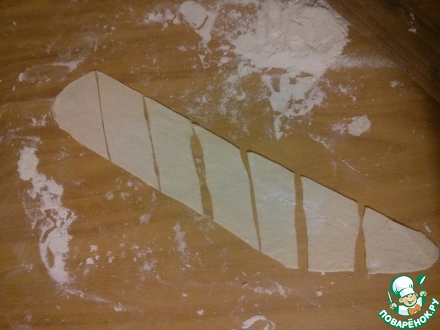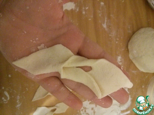 Нарезать тесто на полоски шириной около 5 см, потом полоски нарезать на ромбы, в середине сделать разрез, вытянуть один конец через дырку. Можно нарезать тесто и небольшими прямоугольниками - кому как нравится.