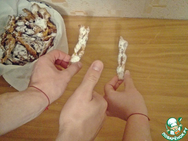 Этот рецепт знаком мне с детства. Когда я их готовлю у меня собирается полная кухня моих родных, все ждут... А когда появляются готовые, посыпанные сахарной пудрой хрустики, то все разлетается за секунду.