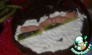 Творог перемешать со сгущенкой. Киви нарезать брусочками. На каждый блинчик выложить творожную массу, киви и застывшее желе (у меня желе получилось мягким и полосочками никак выкладываться не хотело ( ( ( но на готовом блюде это никак не отразилось)))