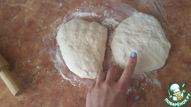 Далее дрожжевое тесто нужно разделить ровно напополам, таким образом, на выходе получится две кулебяки.