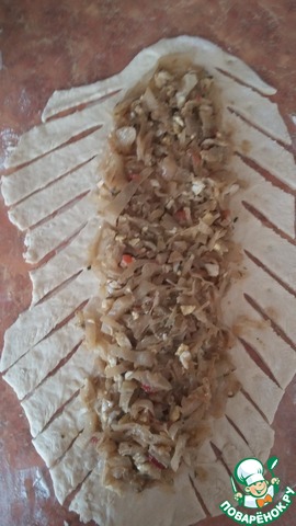 Верхнюю узкую часть положить внахлест на капусту, формируя бортик. Одну полоску теста завернуть на начинку. Следом положить на начинку полоску теста с противоположной стороны.