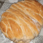 Получается, что полоски теста укладываются внахлест, как косичка. Так пройтись до конца кулебяки, где закрепить нижнюю узкую часть теста так же, как это делалось с верхней.