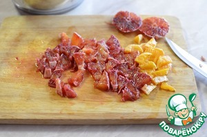 Из 1 мандарина отжать сок, апельсин и второй мандарин почистить и порезать небольшими кубиками.