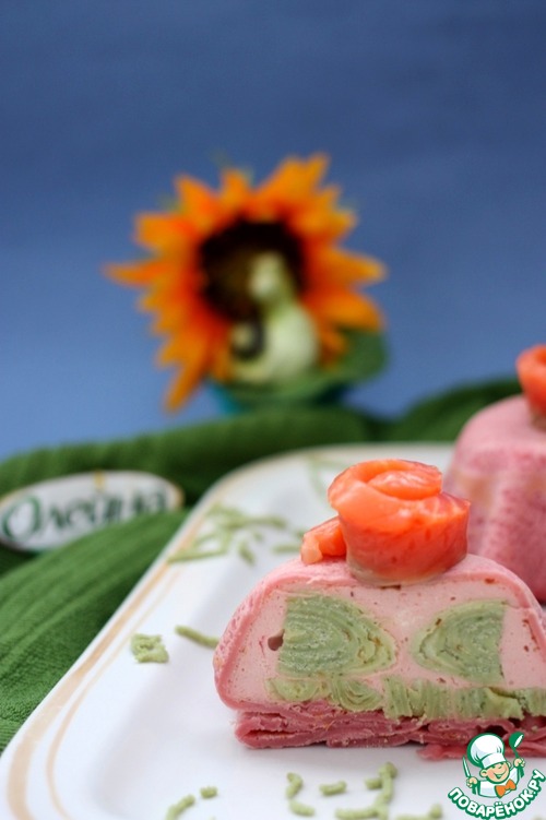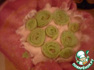 Залить творожной розовой массой. можно также положить остатки зелёного блинчика с васаби. Я сделала так.