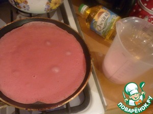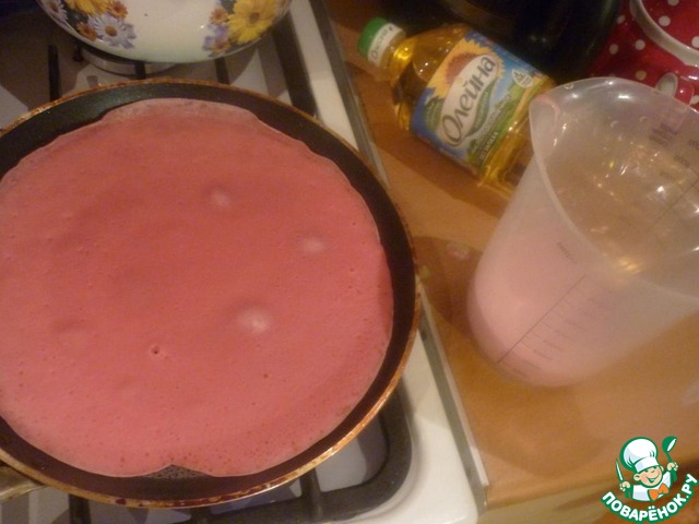 Для красных блинов соединить (взбить) все ингредиенты и обжарить их на сковороде с использованием масла Олейна. Из данного количества ингредиентов получается 5-6 красненьких блинов 25 см диаметром
