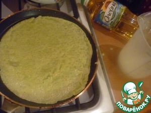 Для Зелёных блинов соединить (взбить) также все ингредиенты и обжарить их на сковороде с использованием масла Олейна. Из данного количества ингредиентов также получается 5-6 зелёненьких блинов 25 см диаметром