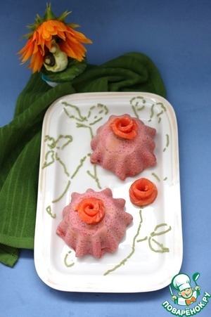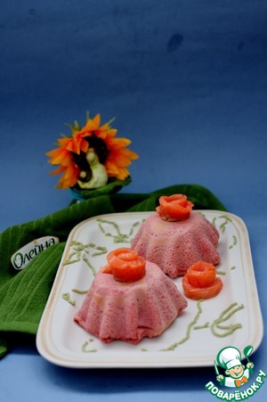 В брусничном соке ( я взбила бруснику в собственном соку) развести желатин, нагреть, но НЕ КИПЯТИТЬ, до растворения кристалликов и влить в творожно-рыбную массу. Перемешать.
