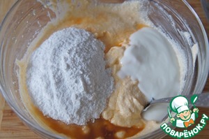 Добавить сахарную пудру, йогурт и ванильный ароматизатор. Я вместо ванильного сахара добавила ванильный экстракт. Все тщательно перемешать.