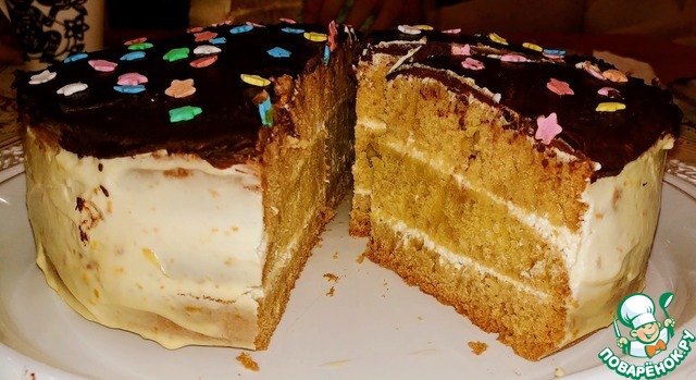 1) Коржи для торта: теста хватает на круглую форму диаметром 20-22 см. Получается бисквит высотой около 2,5 см, который можно разрезать на два коржа. Выпекать около 40 минут.