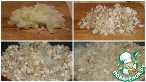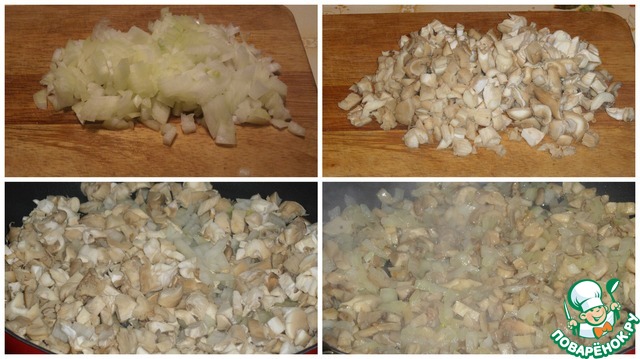 На сковороду наливаем растительное масло и обжариваем до готовности лук и грибы. Солим по вкусу.