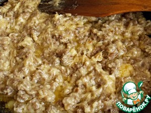Добавить картофельное пюре, перемешать. Всыпать тертый сыр, мешать до тех пор, пока сыр не расплавится.