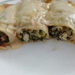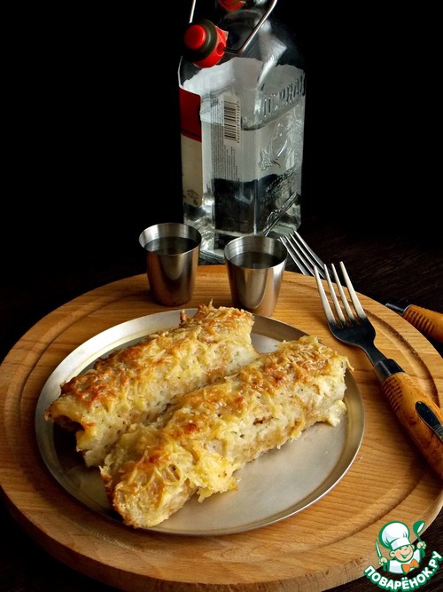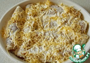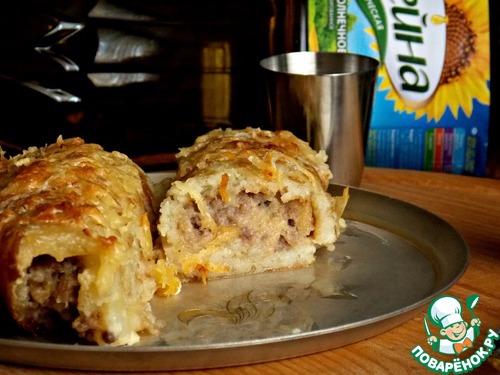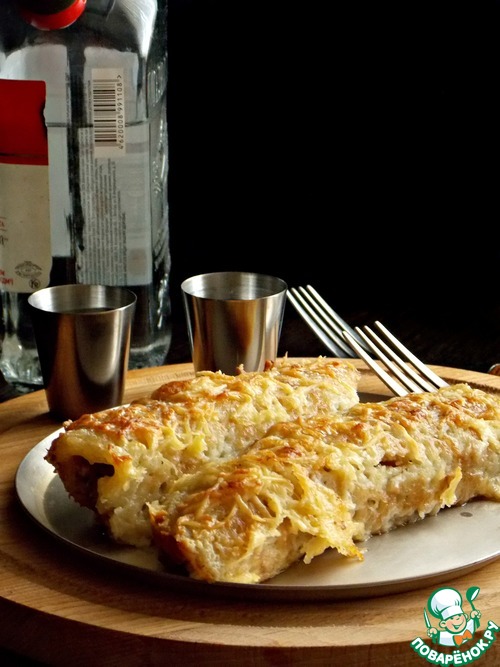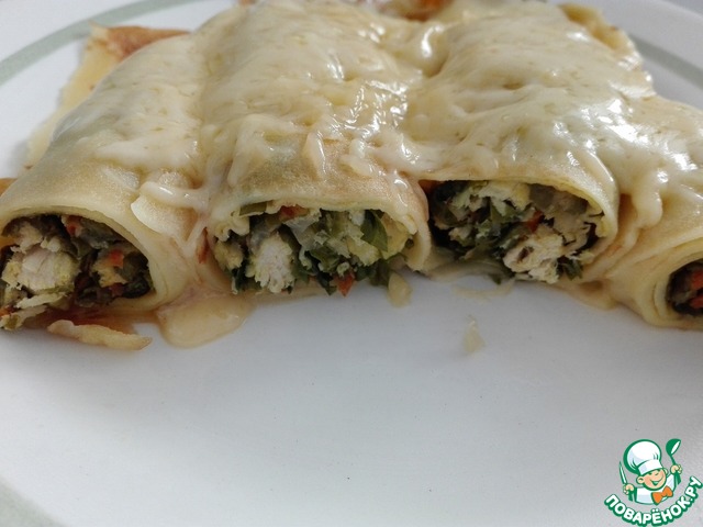 На край блина положить начинку и скрутить трубочку. Сложить блины-трубочки в смазанную маслом форму, плотно в один слой. Посыпать тертым сыром и полить сливками.