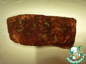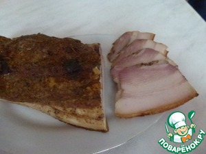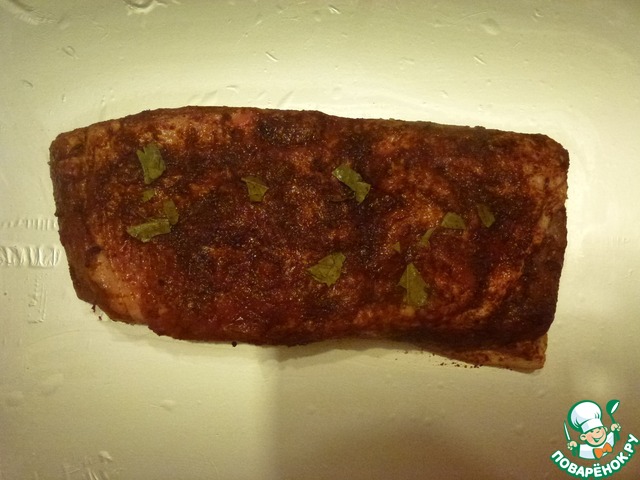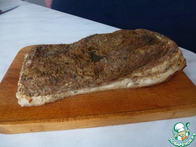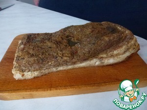 Хорошенько обмазать грудинку со всех сторон сначала солью, затем аджикой, сверху поломать лавровый лист.