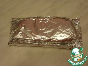 Затем выложить нашу маринованную грудинку в фольге на противень и поставить запекаться в духовку при 180" на 120 мин. После запекания оставить в фольге до полного остывания.