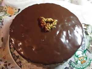 Перед подачей приготовить глазурь: смешать сахарную пудру, какао, крахмал. Воду добавлять по столовой ложке (не более трех), регулируя консистенцию. Рецепт глазури с нашего сайта. Автора, к сожалению не знаю, пользуясь случаем благодарю. В оригинальном рецепте глазурь была другой. Заливаем наш торт глазурью, верх украшаем по желанию. Я растопила на сковороде 0,5 ст. ложки меда и глазировала в нем несколько грецких орехов.