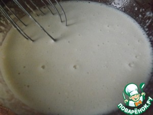 Смешать молоко, яйца, соль и сахар. Добавить муку с разрыхлителем и взбить. Добавить стакан крутого кипятка.