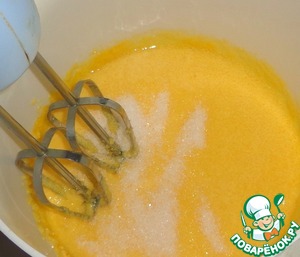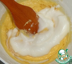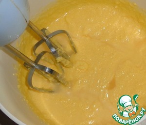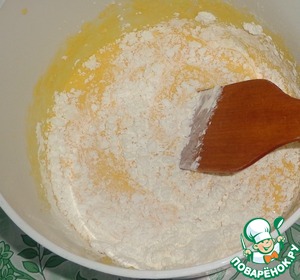 Добавить муку и кукурузный крахмал, разрыхлитель теста. Перемешать.