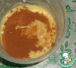 Добавить какао-порошок и сахар с корицей. Перемешать. Тесто готово. Вылить тесто в форму и испечь корж в духовке при 180 градусах. Диаметр моей формы 20 см.