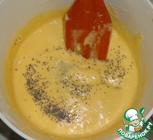 Смешать муку с разрыхлителем теста (у меня разрыхлитель теста с шафраном) и добавить в тесто, перемешать. Добавить взбитые белки, перемешать.