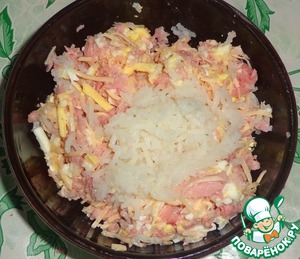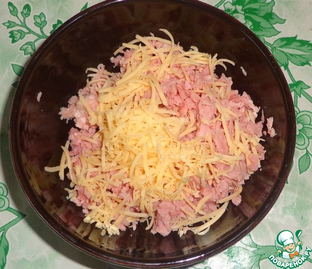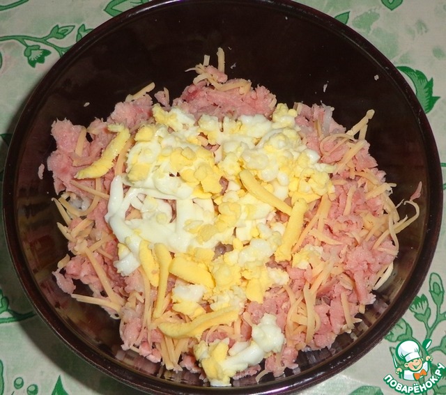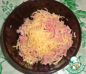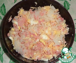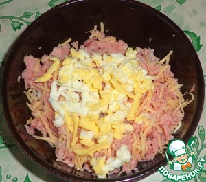 Яйца потереть на крупной терке. Перемешать с ветчиной и сыром.