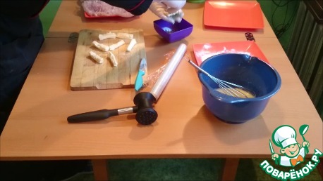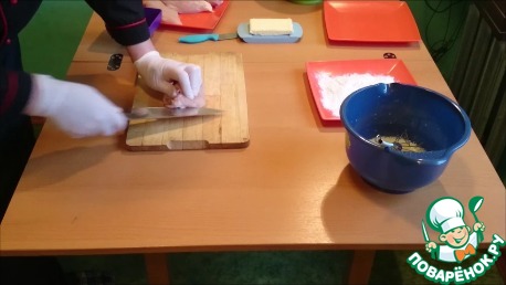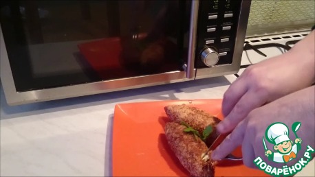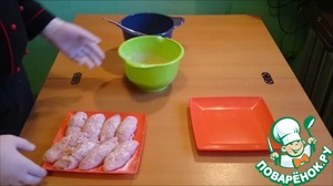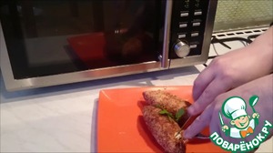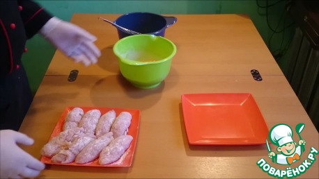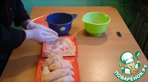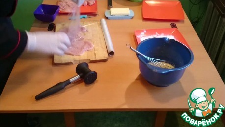 Масло заворачиваем в куриное филе и обваливаем в муке, убираем в морозильник на 15 минут.