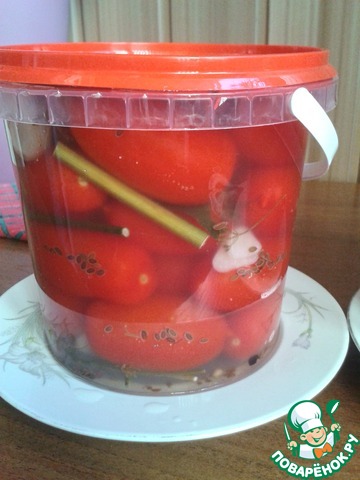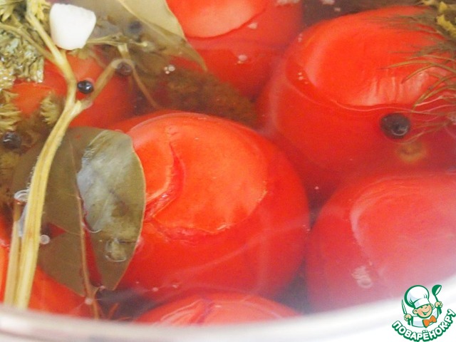 Закипятить воду, кладeм все ингредиенты для маринада, еще закипятить и залить помидоры.