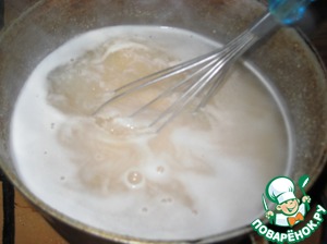 Процесс такой: заливаем стакан горячей воды и быстро накрываем крышкой, будет взрыв, добавить остальную воду быстро, размешивая венчиком, осторожно она будет плеваться, добавляем воду, должна быть жидкая, добавляем соль, закрываем крышкой.