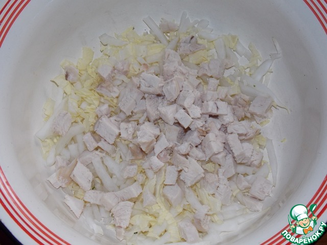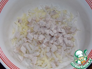 Добавить отварное куриное филе, порезанное кубиком.