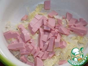 Добавить колбасу, нарезанную кубиком.