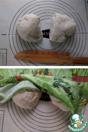 Перебиваем тесто (стол чуть-чуть припудрить мукой), делим его на 2 части, формируем шарики, накрываем мокрым полотенцем и даем тесту отдохнуть в течение 20 мин.