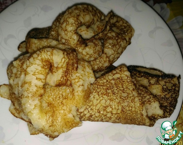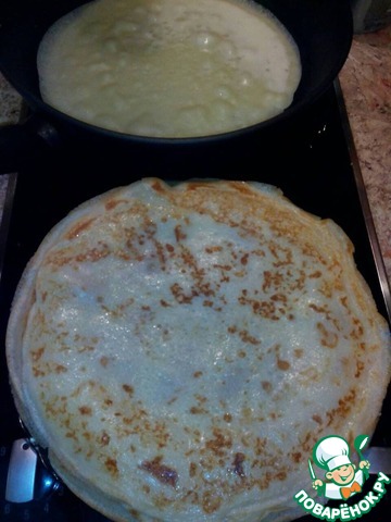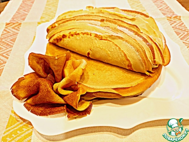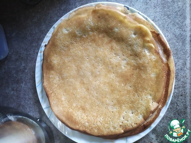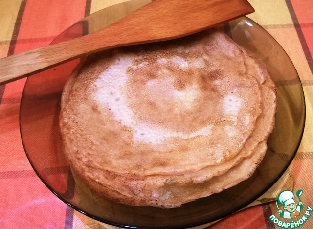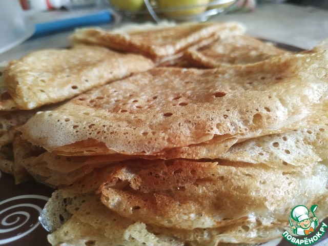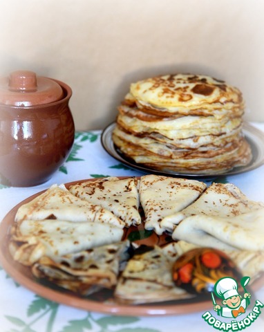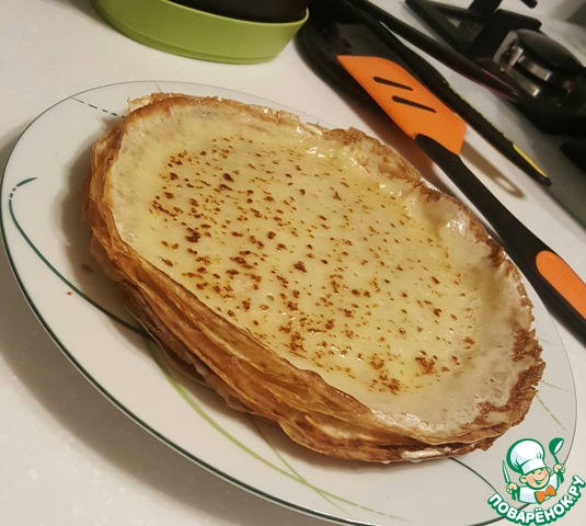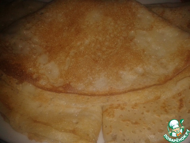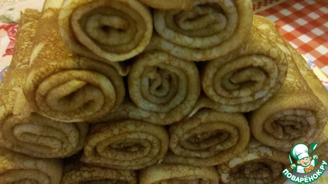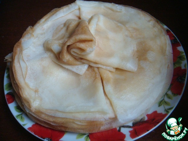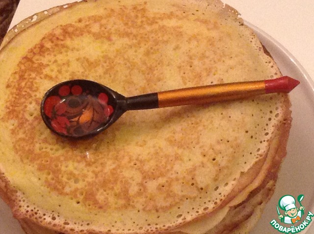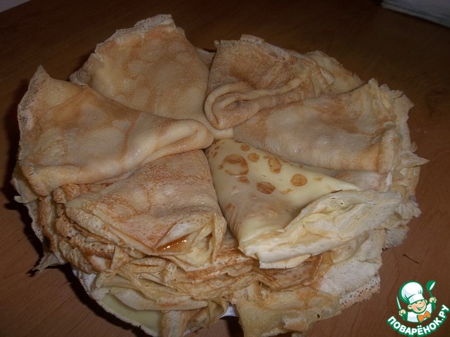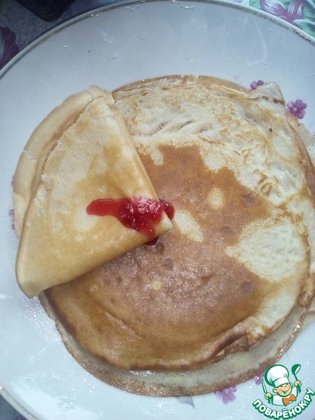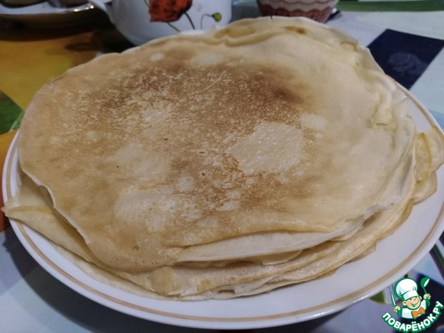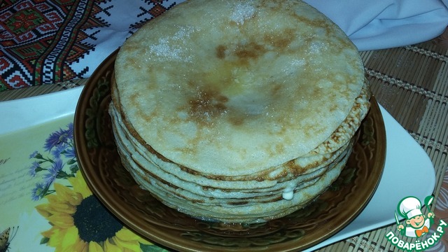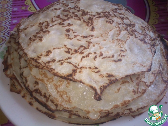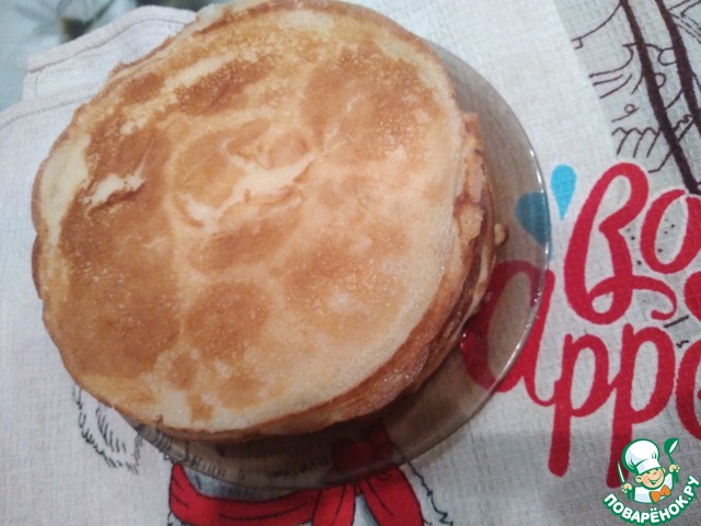 Брала продуктов вдвое меньше и исключила воду, потому что литр сыворотки нужно было использовать, а сто тыщ блинов жарить не хотелось))
