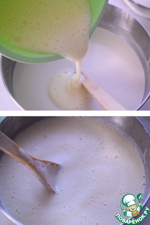 Тем временем, в емкость просеиваем муку и выливаем 3/4 нормы сыворотки (молока, кефира) и миксером с насадкой для теста замешиваем густое тесто. Как только тесто хорошо замесится, выливаем остальную сыворотку (молоко, кефир) и еще раз хорошо перемешиваем тесто. Тесто должно быть как очень густая сметана.