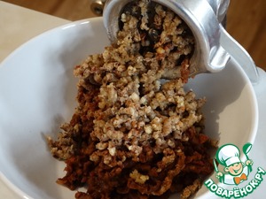 Набухшие яблоки пропустить через мясорубку с крупной решеткой вместе с грецкими орехами. Несколько яблочных долек я нарезала ножом, мне нравится, когда в начинке ощущаются отдельные кусочки.