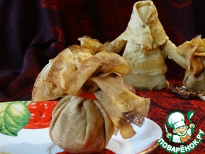 Не могла пройти мимо картинки в интернете с шутливым изображением куклы из блинов. Глядя на неё, на ум пришла фраза, с которой встречают дети мам, пришедших с сумками после работы: "Чекупила?" Моя Чекупила тоже с сумками, то есть с мешочками, а в них разные вкусности. Хотите узнать, что в них, заходите в рецепт! В ингредиентах указаны яблоки, на самом деле взяты сушеные яблоки - сухофрукты.