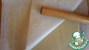Когда тесто чуть охладится раскатываем его между двумя листами пекарской бумаги. Затем, снимем верхний лист бумаги и, прямо на нижнем листе, переносим на противень и ставим в предварительно разогретую до 175-180° духовку выпекаться, минут на 15.