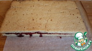 Готовый корж разрезаем пополам и на одну половину сверху намазываем варенье. Варенье может быть любым, главное, чтобы было несладким. Второй корж акуратно укладываем на первый и даём коржам остыть