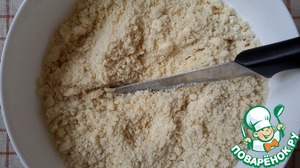 Смешиваем муку, сахар, разрыхлитель. Добавляем сливочное масло комнатной температуры и превращаем всё это в крошку. Я это сделала при помощи ножа - просто всё порубила. Можно просто размять руками или, даже взбить миксером.