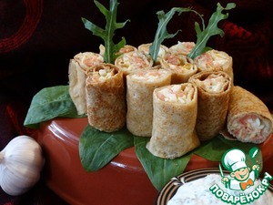 На каждый блинчик положить по 2 столовые ложки начинки, свернуть трубочкой. Поставить в холодильник до подачи.