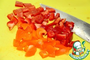 Болгарский перец порезать небольшими кусочками или тонкими полосками.