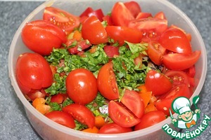Измельчить листья петрушки, помидоры черри порезать пополам или четвертинками, если черри крупные.