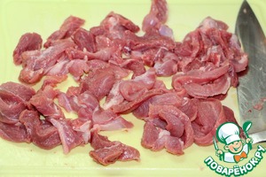Филе бедра индейки зачистить от пленок, порезать кусочками или полосками, как на бефстроганов