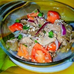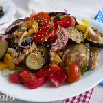 К филе маринованной индейки (соевый соус можно не сливать) добавить баклажаны, лук, маслины-оливки, болгарский перец, петрушку и помидоры ( именно в такой последовательности).