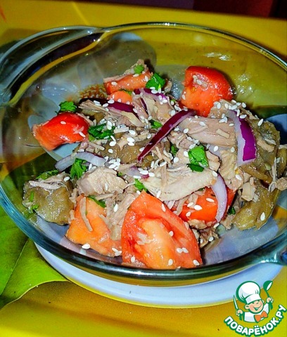 Рецепт из семейной копилки многолетних праздничных застолий. Этот салат я готовлю лет эдак 15. На все праздники без исключения, невзирая на время года! Всем нашим знакомым, друзьям, коллегам, родственникам рецепт полюбился давно и прочно занял почетное место и на их праздничных столах, причем место центральное, поскольку смотрится ярким пятном, невероятно вкусен и заканчивается сразу. Имеет только один недостаток, его можно подавать только в большом салатнике. Из-за большого количества ингредиентов в стаканы не умещается, в кольцах разваливается. Рекомендую приготовить хотя бы разочек, чтобы влюбиться в него навсегда. И хоть салат не быстр в приготовлении, но поверьте, это того стоит. Количество ингредиентов увеличить или уменьшить по собственному желанию, побольше индейки или баклажана, поменьше перца, это уже дело вкуса. Главное принцип приготовления!