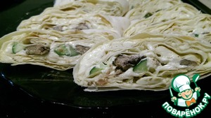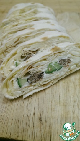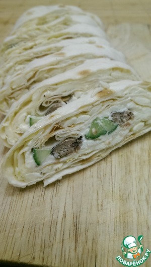 И все, собираем наш рулет! Смазываем лаваш сырно-чесночной смесью, выкладываем огурец и шпроты. Плотно скручиваем рулет и оборачиваем в пищевую пленку, отправляем на несколько часов в холодильник, лучше на ночь. По желанию можно добавить перья зеленого лука.