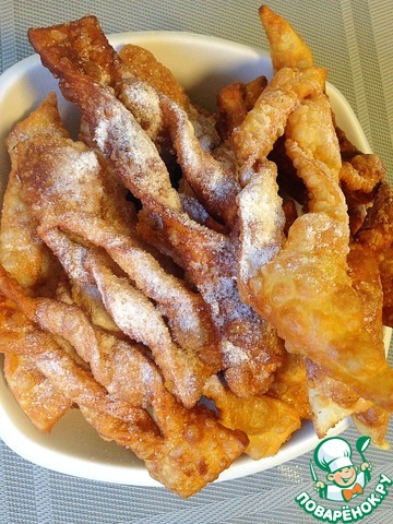 Опускаем в масло хворост по 3-4 штучки и жарим, поправляя слои теста вилкой и переворачивая, до золотистого цвета со всех сторон примерно 2-3 минуты. -