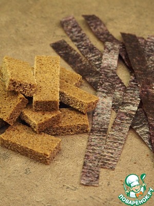 Нарежьте хлеб на такие же кусочки. Листья нори нарежьте полосками.