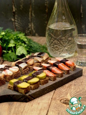 Положить каждый кусочек колбасы, сала... на хлеб и скрепить полоской нори.