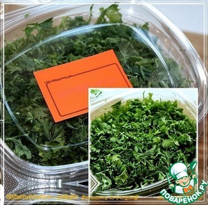 Зелень. Не пошел я в сельпу за всякой гадостью иностранной. Хоть и свежей. Достал из морозилки свою петрушку с укропом. С лета замороженные.