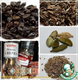 Барбарис. Перцы. Смесь и белый взял. Зира!!! А как без нее. И немного укропного семени. Ну и соль, конечно, а также неострого красного молотого перца, паприки то бишь.